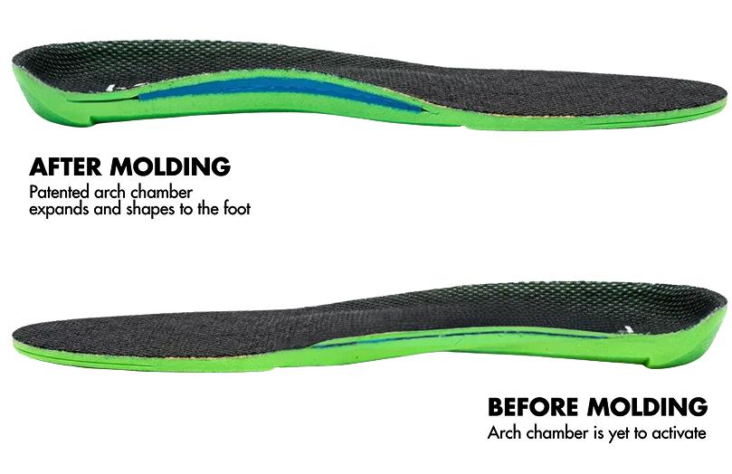 - One of a kind Heat-Moldable custom arch support that forms three-dimensionally to your foot when heated.