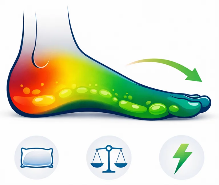 - Cuts daily fatigue dramatically — average insoles transfer 6,000–12,000+ kN of shock into the body per step.